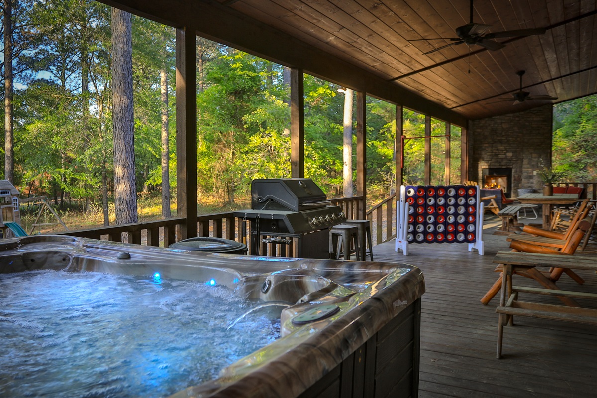 Step outside onto the covered back deck and relax in the hot tub. A table for 8 and grill